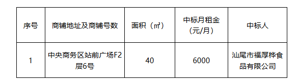 汕尾市投控工程咨詢有限公司受汕尾市投控城市運(yùn)營(yíng)服務(wù)集團(tuán)有限公司委托于2026年3月10日10時(shí)30分,就汕尾火車站站前廣場(chǎng)商鋪招租項(xiàng)目,在汕尾市區(qū)濱湖路泰濠公寓一棟(中鑫大廈)寫字樓四層組織開標(biāo)評(píng)標(biāo)會(huì)議,現(xiàn)將本次公開招租結(jié)果公示如下: 如對(duì)以上結(jié)果有任何異議,請(qǐng)于2026年3月19日下午16:00前以書面的形式實(shí)名反映,逾期將不再受理。 地址:汕尾市城區(qū)站前橫四路市民服務(wù)廣場(chǎng)8樓 聯(lián)系人/聯(lián)系電話:余工 0660-3879859